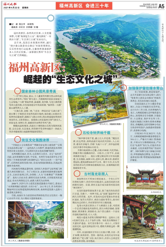 目前高新区正全力建设幸福闽江,打造大学城最美水系环境,近日出台工作方案,以改善域内乌龙江、大樟溪流域生态环境质量为核心,统筹推进安全保障、污染防控、生态修复、保护开发等工作。高新区加强江河源头重要水源涵养区、珍稀濒危及特有物种分布区生物多样性保护;加强森林资源保护,改善林分结构。